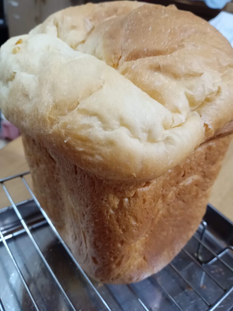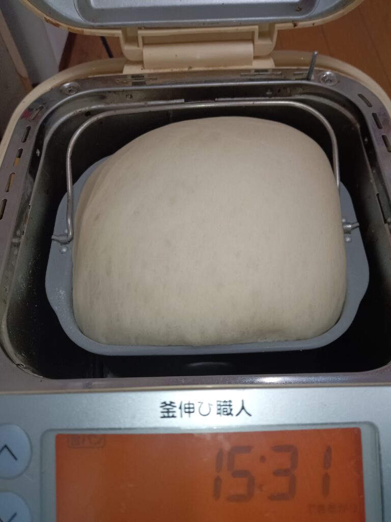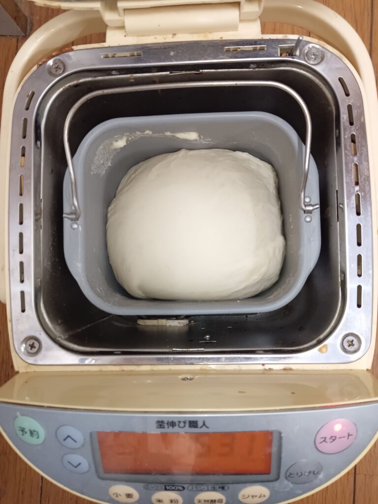 このベーカリーはちょっと小ぶりなので、強力粉を250グラムにするとご覧の通り膨らむとあふれてしまいます。粉を減らせば良いのですがそれに合わせて他の材料の分量を決めないといけないので、それが面倒でこのままで使っています。