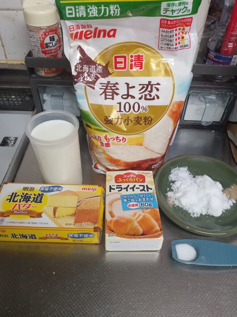 牛乳→粉類→ドライイースト→無塩バターの順に型に入れホームベーカリーにセットします。