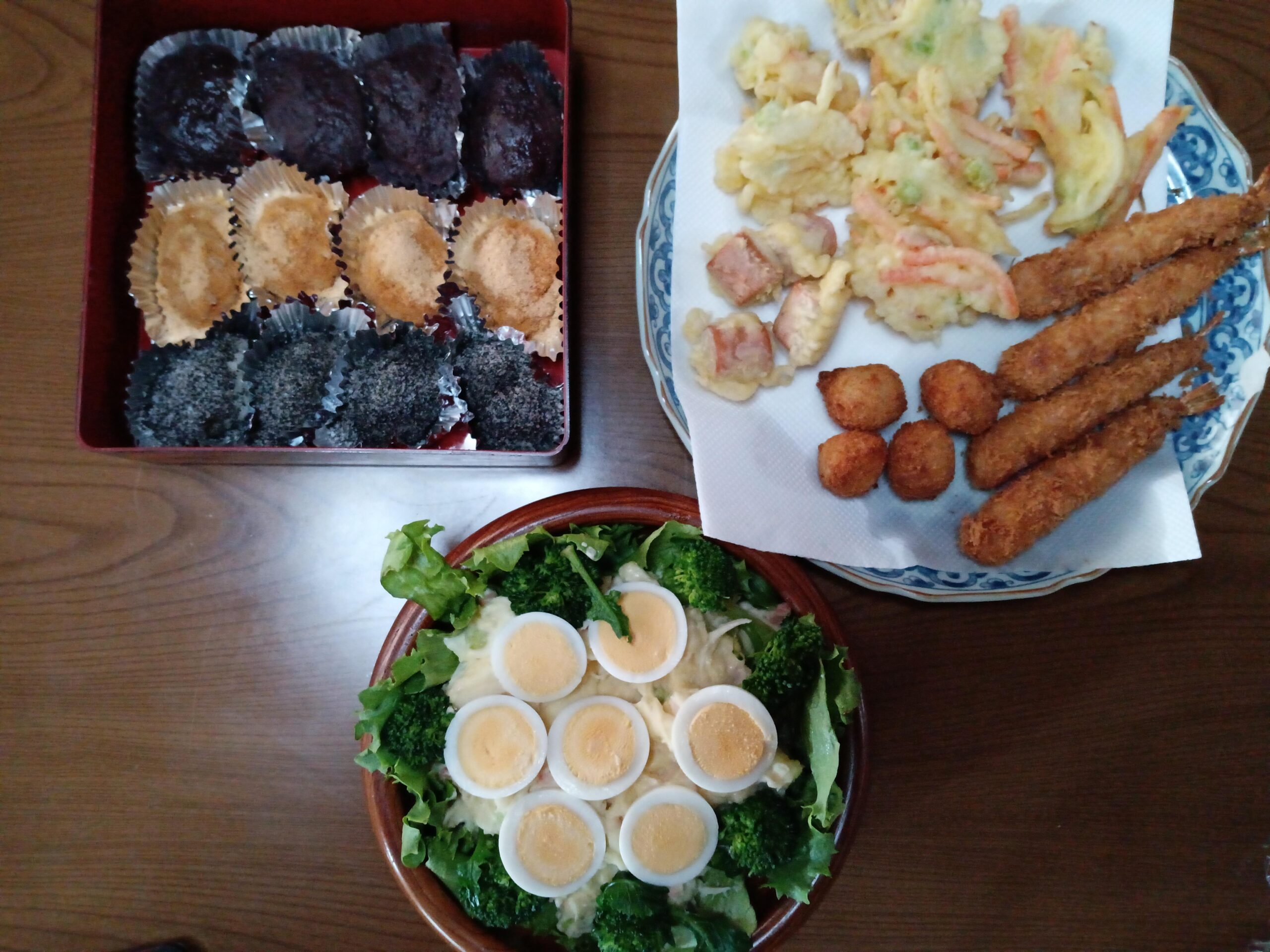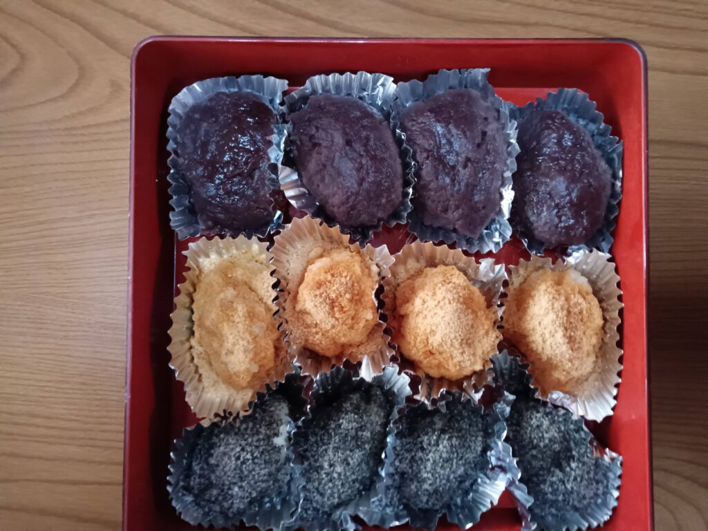 今回は義姉2人義兄1人夫の3人なので餅米は2合にしました。あんこの他にきな粉、黒ごまのを作りました。仏壇にお供えし残りは重箱に詰めました。