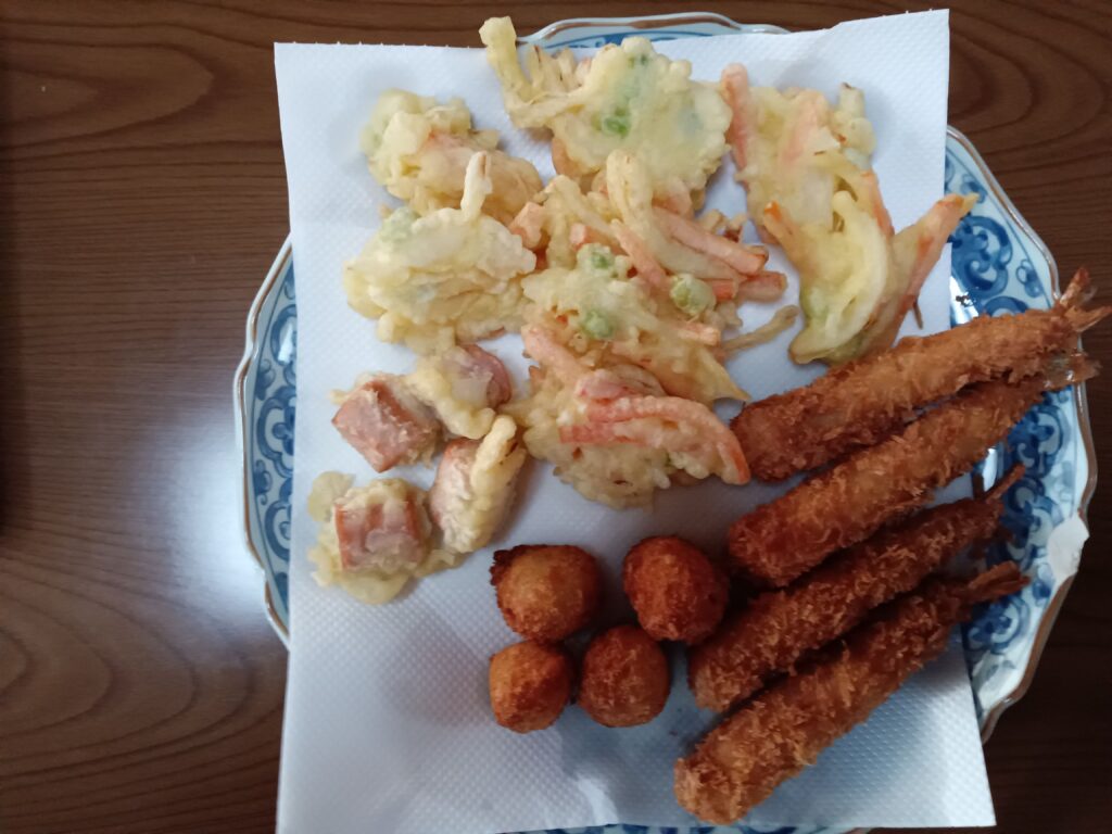 玉葱とにんじんと枝豆のかき揚げと、ソーセージの天ぷらを揚げます。一緒にエビフライとウズラ卵のフライも揚げました。うどんを茹でましたのでこれでちょっとしたおもてなし風のお昼になりました。