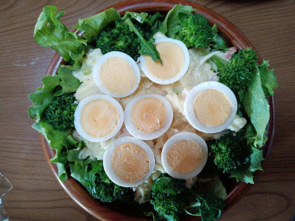 レタスを強いたサラダボールに盛り付けをし、最期にゆで卵とゆでたブロッコリーをのせてできあがりです。結構手間暇かかります。