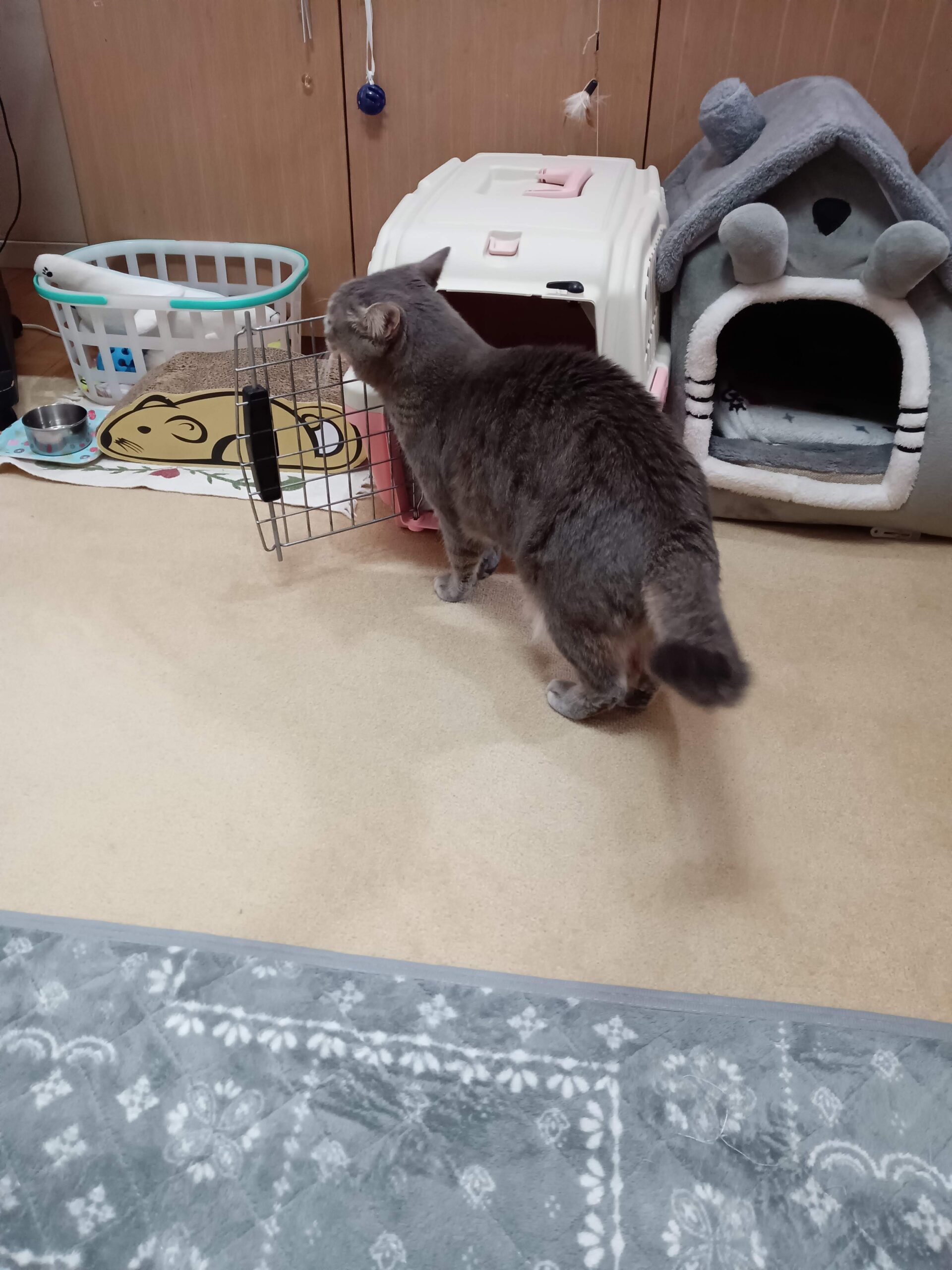 知らん顔をしつつ「みーちゃん、出かけようね~」と捕まえてキャリーに入れました!!「やった~!!」と心の中で叫び、急いで車に乗せて出かけました。