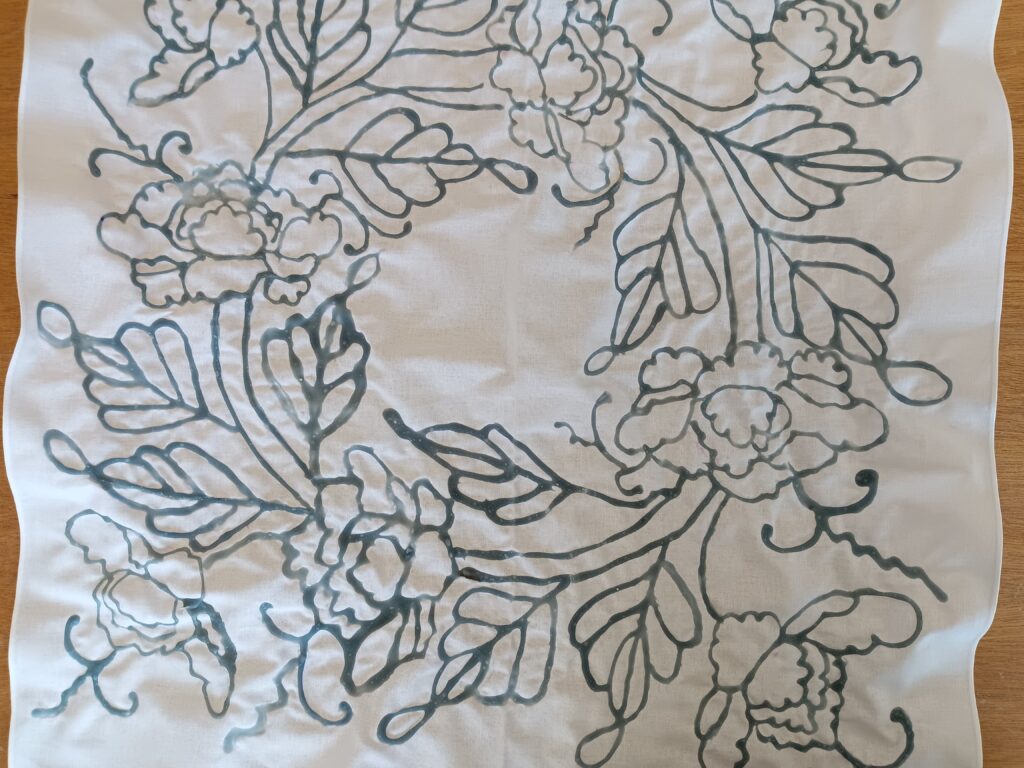 ①まずは下絵を布にしるし付けペンで移し、移した線に沿って糊で模様を描いていきます。