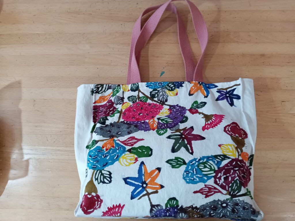 文化祭の出品も10回目となりますが昨年は畑仕事がお教室の日に重なりお休みが続き作品もあまりできませんでした。その中で、シーサー柄のバッグと花柄のバッグ、アヤメのタペストリーの3種を出品しました。