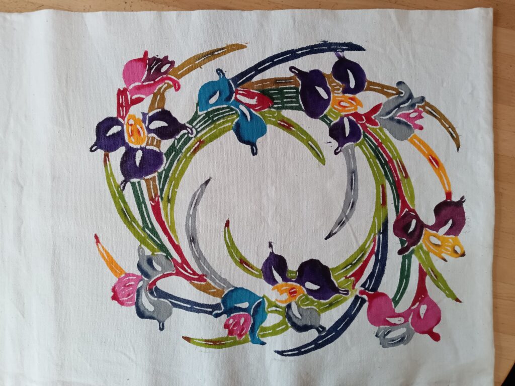 紅型染めは10年ほど前、近くの文化センターの講座に参加する事からはじまり週1回土曜日の午前中に10名ほどが集まり、先生の指導を受けながら取り組んでいます。40歳代50歳代60歳代だったわたし達も10歳年を取り一番若いNちゃんも54歳。私も還暦を迎えるなど時の流れを感じます。で、少しは上達したのかと思いきや、なかなか、なかなか。
