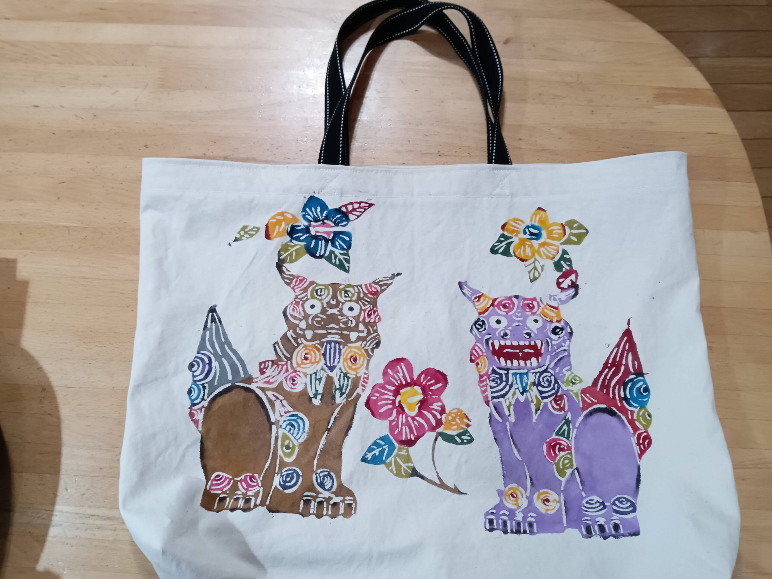 文化祭の出品も10回目となりますが昨年は畑仕事がお教室の日に重なりお休みが続き作品もあまりできませんでした。その中で、シーサー柄のバッグと花柄のバッグ、アヤメのタペストリーの3種を出品しました。