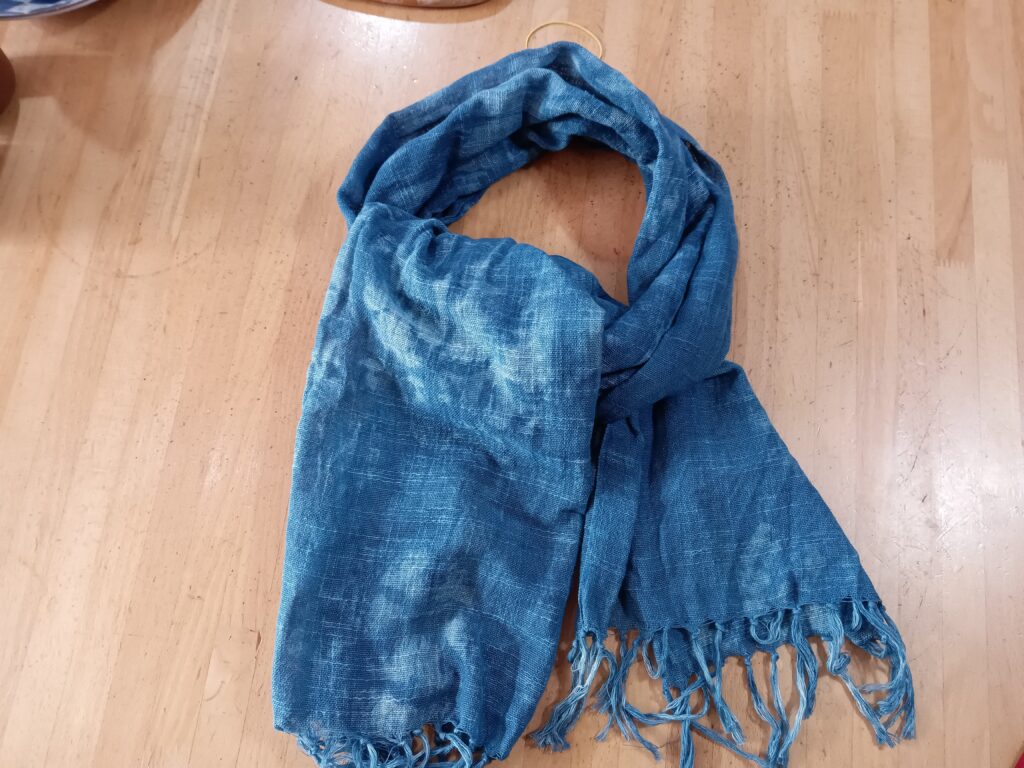 もう一枚は自分で染めた藍染めのストールです。こちらも紅型の先生が立ててくださった『藍』を使わせていただき染めました。ぐるぐる縛ってドボンとつけたらこのようにまだらになってしまいました(^0^;)