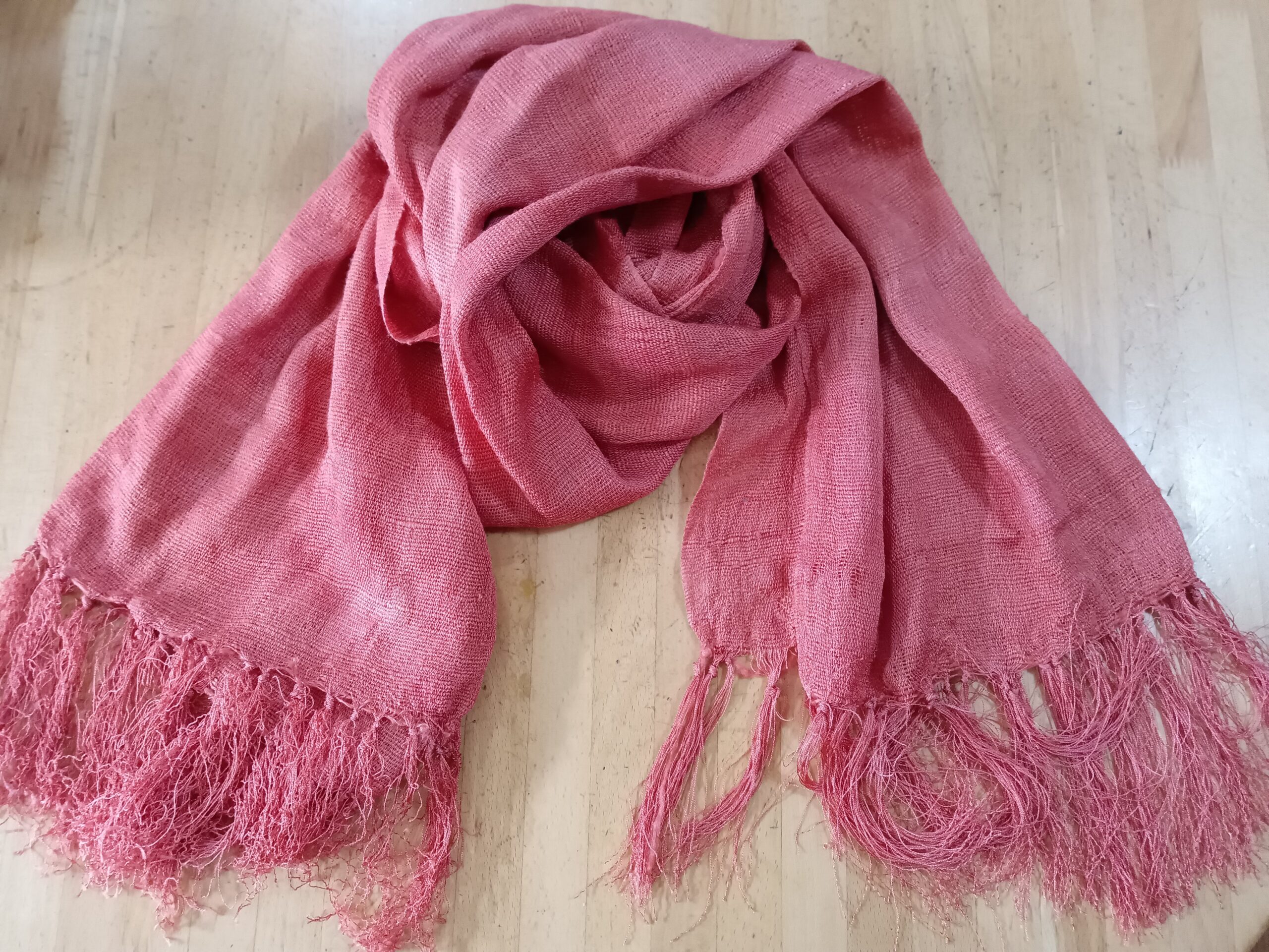 紅型の先生から草木染めのストールを譲っていただきました。「あなたにはあかね色が合うと思って」と『あかね』の根で染めたものだそうです。よく『あかね色』って聞きますよね。あかねという植物の根から出る色なのです。初めて知りました。とても綺麗な良い色です。ストールは首に巻くので顔色が良く見える色を選びたいものですが、あかね色も良いと思いました。